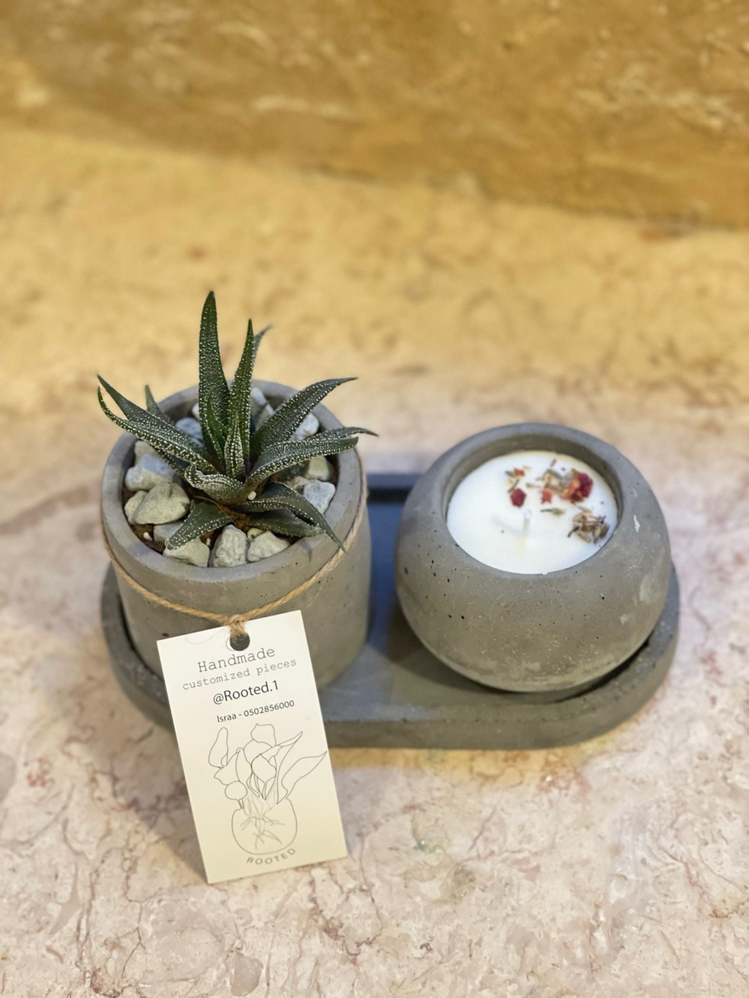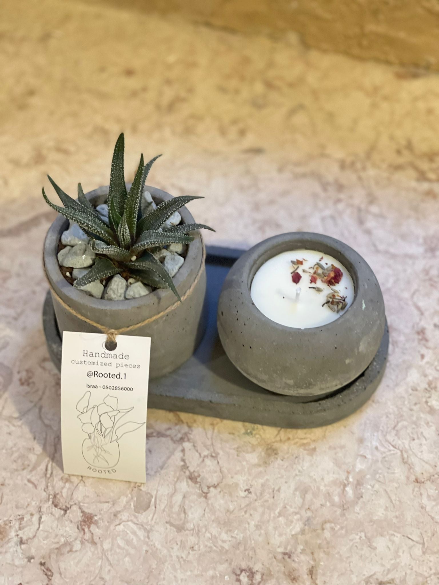 3 pieces set – cactus & concrete planter, tray, natural bees wax scented candle.